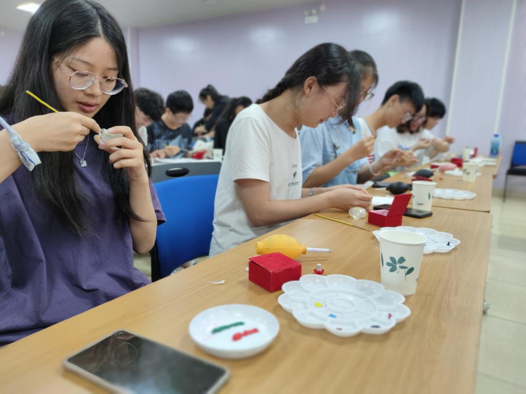 沈红妹以《方寸之间 尽展乾坤——内画艺术初探》为题,从内画的起源、内画与外画的差异和内画的发展等方面进行了详细讲解。并带领全体同学在现场动手作画。她以中国共产党党徽作为模板,现场教授同学们如何用内画在瓶内画出党徽。