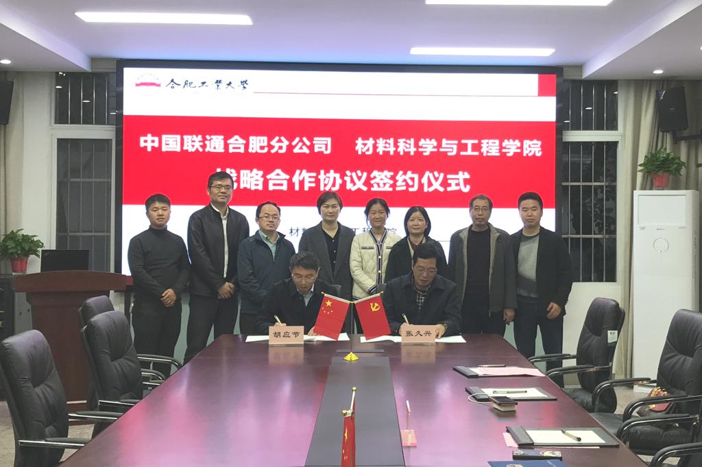 张久兴与胡应节分别代表校企双方签署战略合作协议书。根据协议,中国联通合肥分公司同材料学院在人才交流与培训、新材料研究、产学研项目合作、实习基地建设、创新创业项目、5G信息化建设等方面开展深度合作。