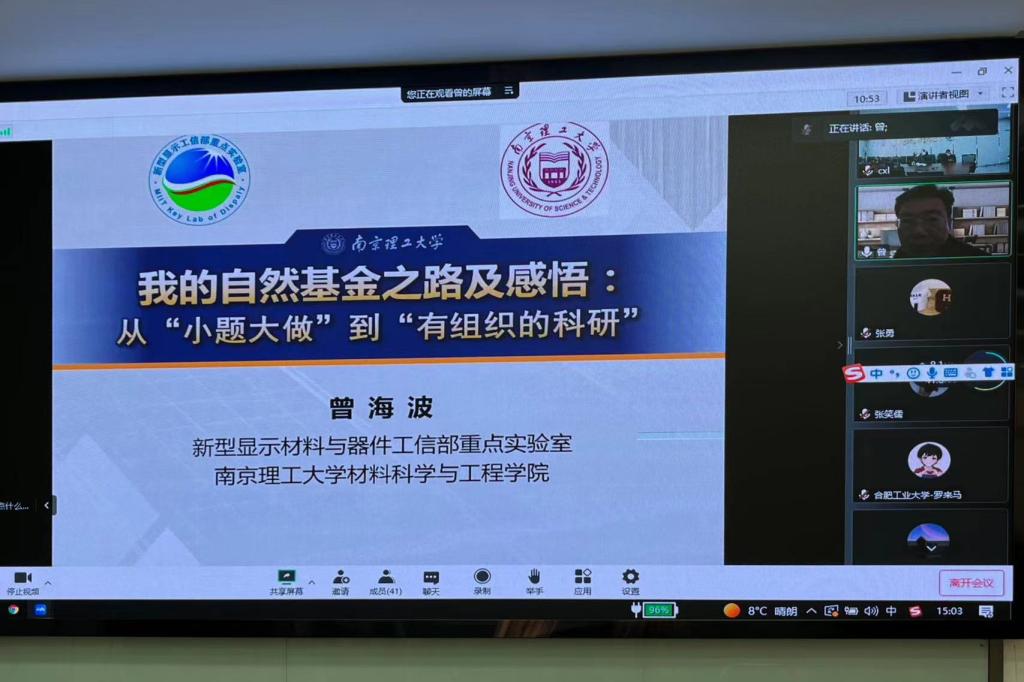 12月14日下午,南京理工大学材料学院院长曾海波教授应邀以在线会议的形式为必赢线路检测3003全体教师做了题为《我的自然基金之路及感悟》的专题报告。报告由必赢线路检测3003副院长罗来马主持,必赢线路检测3003副院长周如龙教授及学院近百名教职工参加了报告会。