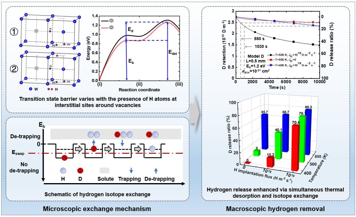 未来聚变堆材料将面临着燃料氢同位素(氘、氚)的渗透与滞留问题,氢同位素交换可有效去除材料中的滞留氚,对聚变堆的安全稳定运行起到重要作用。我校孙飞教授和硕士生郝铖等基于多尺度方法研究了氢同位素的交换行为,研究发现氢同位素交换将受到三种效应的协同驱动:竞争性重捕获、碰撞、置换。将氢同位素交换与传统热解吸法相组合可以显著降低所需的氢去除温度,并增强去除速率。该成果为理解和设计未来聚变堆材料中的除氚工艺提供了理论依据。