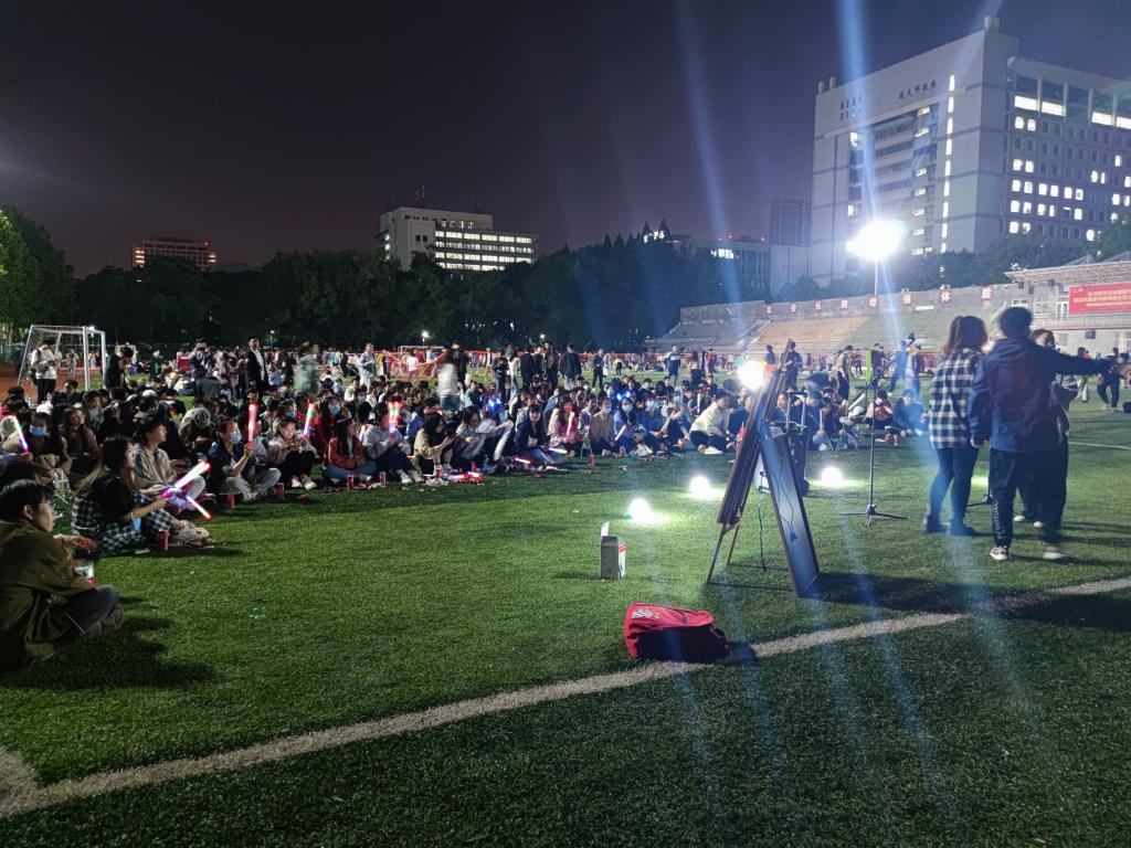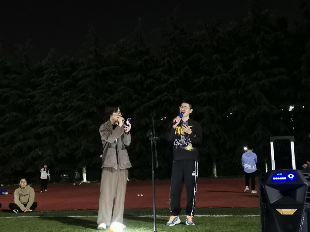 随着暖场音乐的逐渐响起,同学们在操场上就地围坐,主持人简单宣布注意事项后,音乐节于晚7点准时开场。在被荧光棒和闪光灯簇拥的草地中央,一首首动听的歌曲萦绕耳旁,无论是浪漫动人的情歌,还是律动炸场的说唱,亦或是热血有力的摇滚,都收获了场下观众的呐喊欢呼和真诚掌声。随着曲风逐渐多样,场地中也逐渐聚集了更多观众,土木学院林晨阳同学带来的《小镇姑娘》将现场气氛推到了最高点。在同学们一展歌喉的同时,主持人利用演唱间隙组织了“抢麦接歌词”以及“听前奏猜歌名”等趣味游戏,很好地调动了场内同学的气氛。在欢歌笑语中,在《恋爱ing》大合唱中,全场同学为本次音乐节画上了一个完美句号。