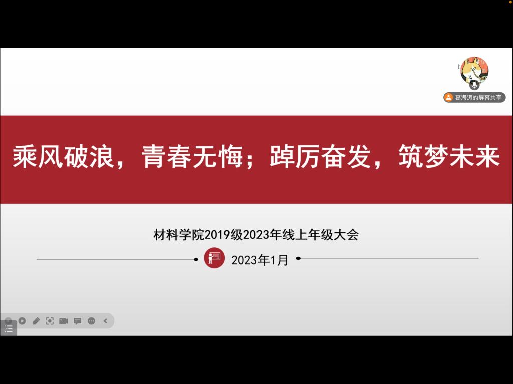 为切实做好寒假学生安全教育和就业工作,进一步提升同学们的安全防范意识,保障学生群体安全有序离校,积极落实寒假学生安全教育管理工作,1月10日晚,材料学院组织2019级学生召开以“乘风破浪 青春无悔;踔厉奋发 筑梦未来”为主题的线上年级大会,学生辅导员及全体2019级学生参加会议。