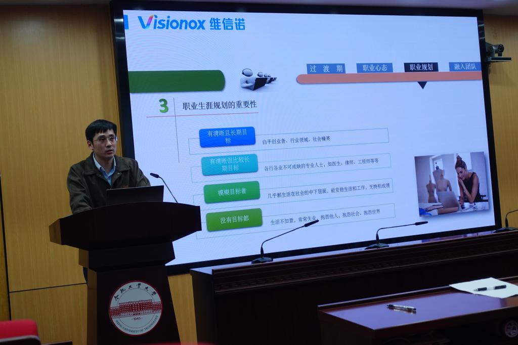 葛丰从如何调整求职心态作为切入点进行分享。葛丰说,作为求职者要学会应对从学生到职场的角色转变,要调整自己的职业心态,努力让自己的成果与回报相匹配,拥有积极进取的心态,不断提升自我。在工作过程中,要有明确的职业生涯规划,有清晰且长期的目标。就职期间与学生时代最大的不同,就是要融入团队,学会团队合作,做好团队的一份子,团结团队为社会解决更多的问题,这既是责任心的体现又是自我的挑战与提升。