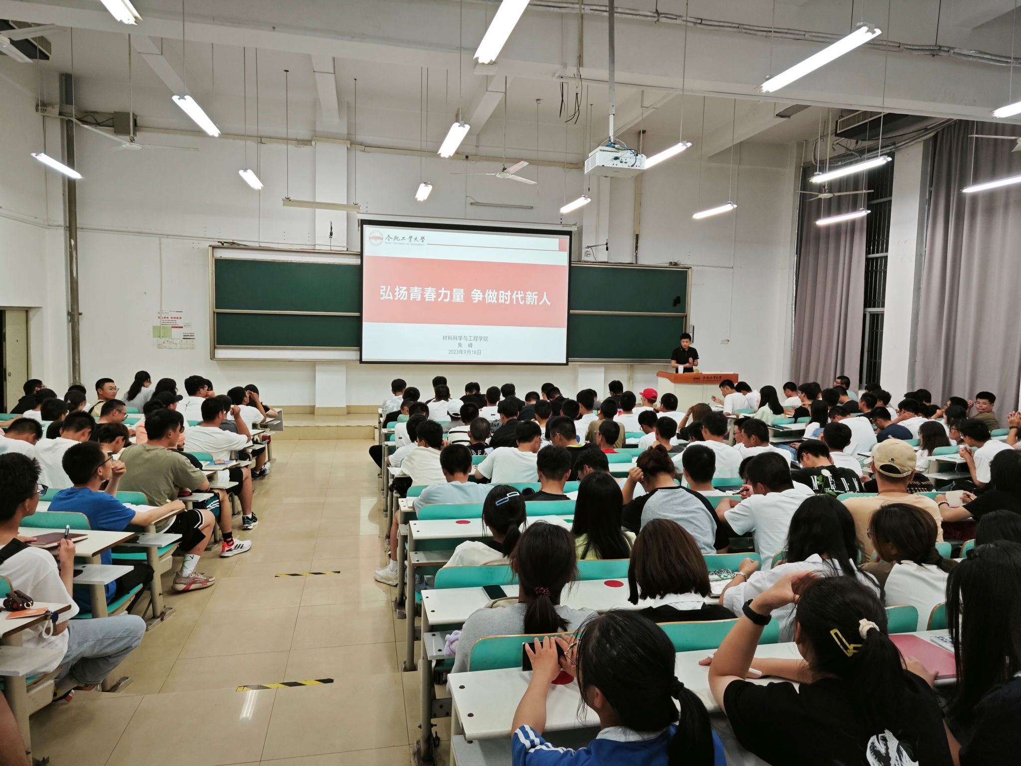 9月18晚,材料学院于一教102教室开展“弘扬青春力量,争做时代新人”新生理想信念教育讲座,学院党委副书记兼纪委书记朱峰为全体2023级同学作报告。