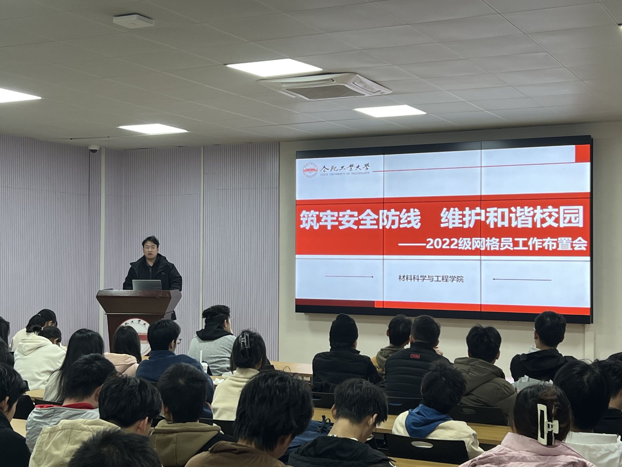 11月28日,必赢线路检测3003在翡翠湖校区综合楼一楼报告厅开展“筑牢安全防线 维护和谐校园”网格员工作布置会,2022级全体网格员、心理委员、生活委员参与本次活动。