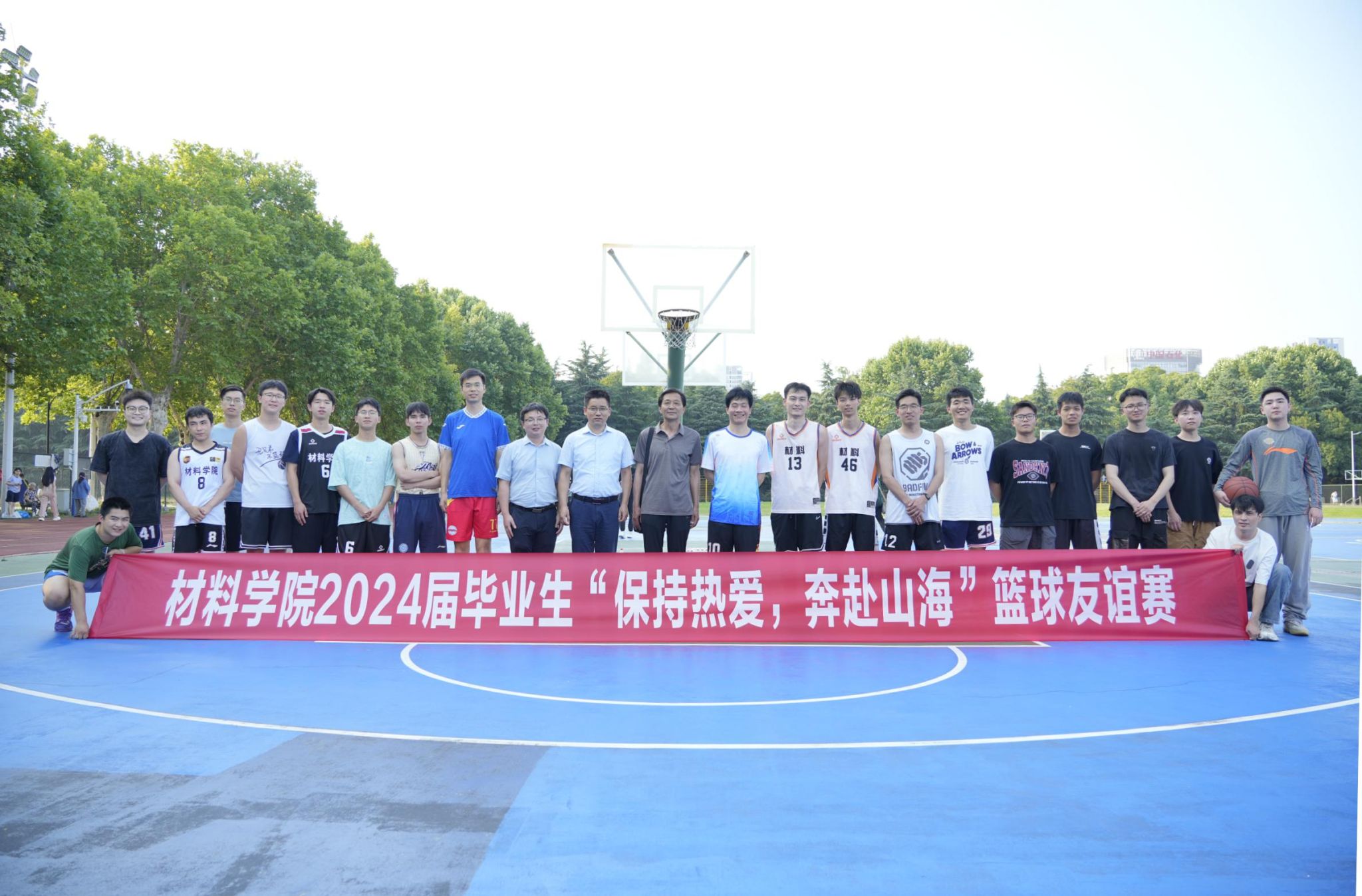 6月12日下午,必赢线路检测3003在屯溪路校区东篮球场举办了2024届毕业生“保持热爱,奔赴山海”篮球友谊赛。学院教师代表、本硕毕业班学生代表参加本次活动。