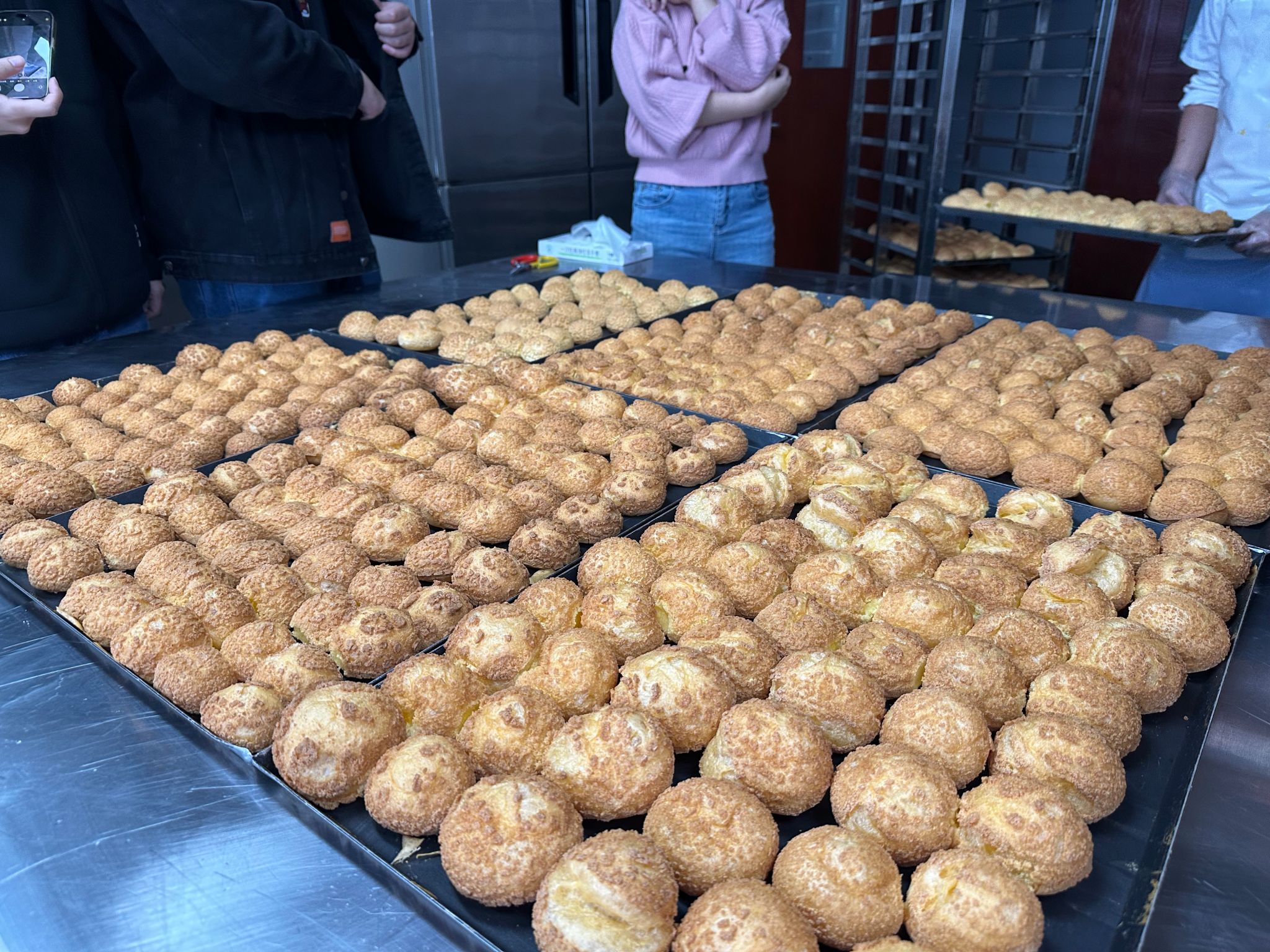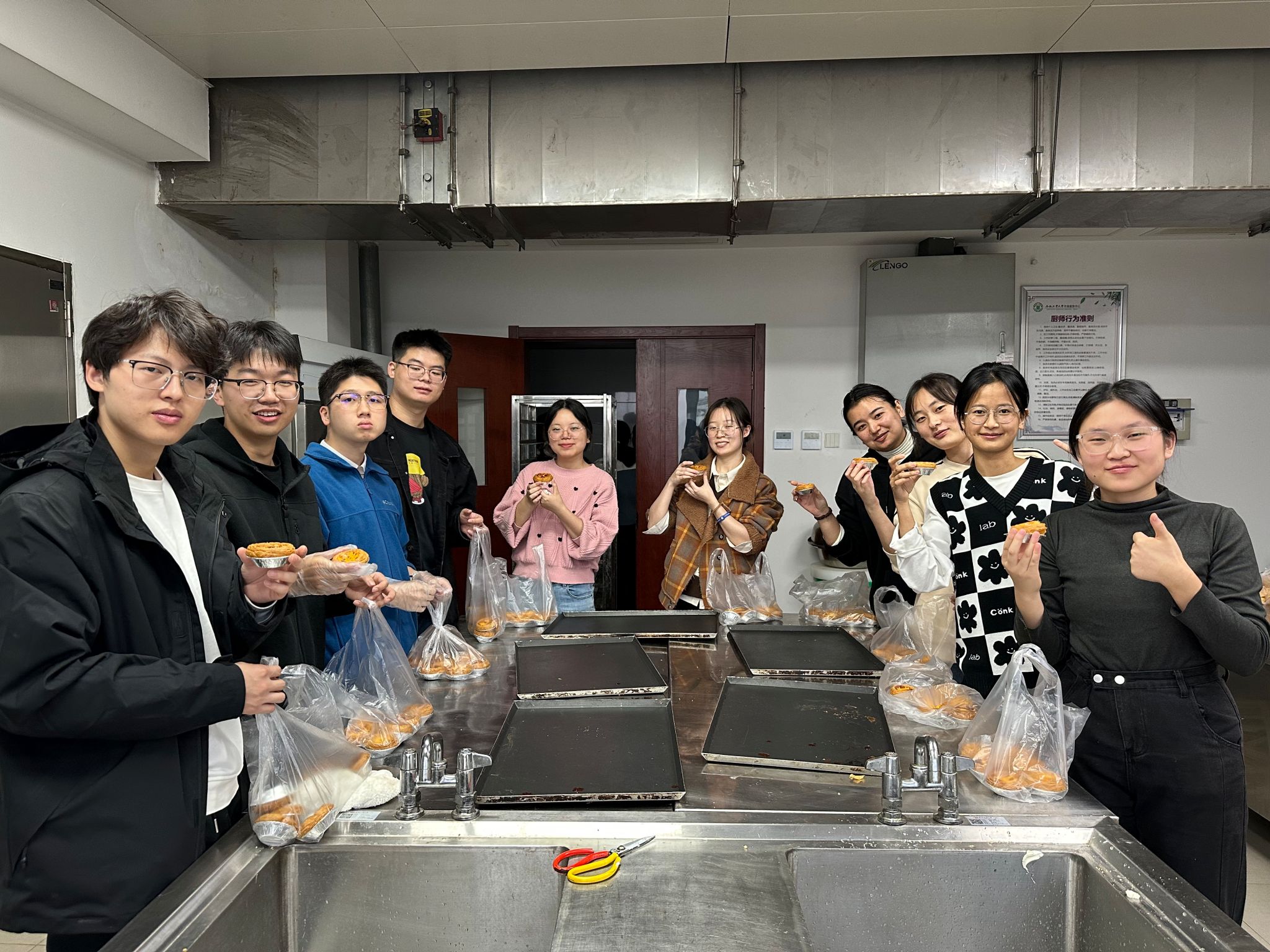 活动共分为烘焙知识讲解、甜品制作和美味体验三个环节,计划学习制备泡芙和蛋挞两类甜品。活动伊始,由饮食服务中心陈集新师傅向同学们讲解两类甜品的制备方式,从工具选用、材料准备、用量说明及操作技法等方面,向同学们一一进行教学示范。随后,同学们按照操作要求,带上手套,拿上工具,开始尝试独立制备甜品。虽然在开始时,不少同学便遇上了拦路虎,挤压出的泡芙模型不成规范,但在陈师傅的耐心指导和周围同学的互相帮助下,均渐入正轨。在一片欢声笑语中,同学们共同完成了两类甜品的制作。活动最后,伴着烘焙独有的香甜气息,同学们一边品尝,一边互相分享着成功制作的喜悦,活动现场气氛热烈,其乐融融。