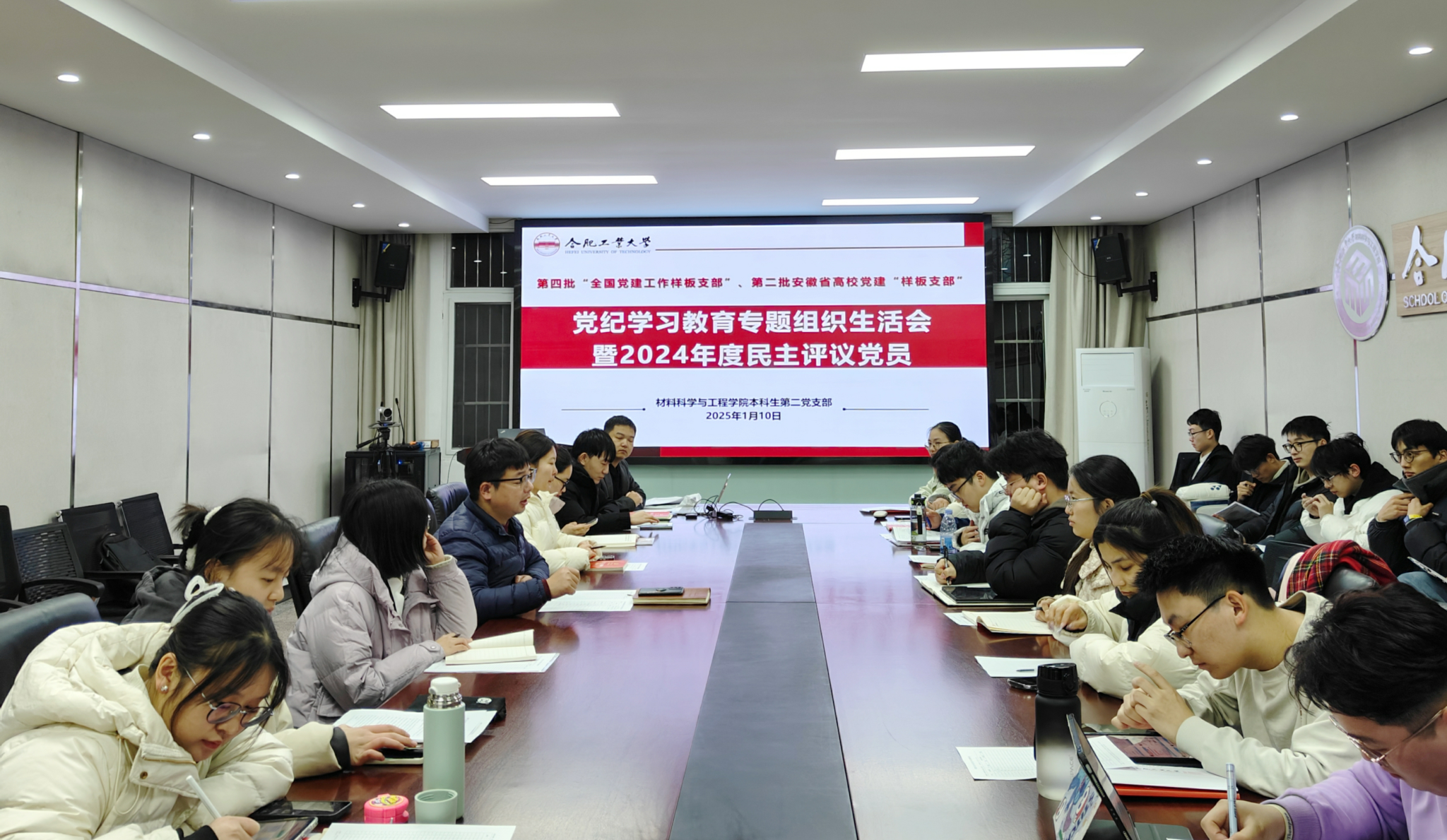 1月10日晚,全国“样板支部”、必赢线路检测3003本科生第二党支部在屯溪路校区小红楼210召开了党纪学习教育专题组织生活会暨2024年度民主评议党员。会议由党支部书记马贤峰主持,党支部全体党员30余人参会。