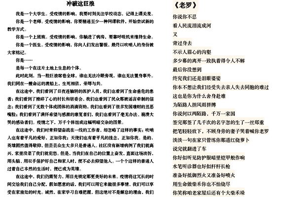 主题征文活动是材料学院在疫情期间继续推进疫情期间第二课堂建设的系列活动之一。自活动开展以来,深受同学们喜爱与支持,激发同学们主动去思考自己在疫情中扮演的角色,将自己的感受以文字的形式记录下来。同时本次征文活动也体现出了新时代大学生们积极思考、不断探索的精神风貌,激发起了同学们的爱国热情!