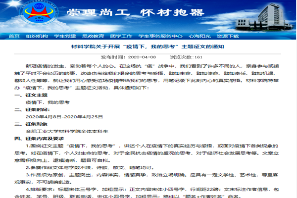 2020年初持续到现在的新冠疫情,不仅深刻影响了世界形势、国家治理、社会经济,更是给个体心理、情感和思考带来变化和感悟。 新时代的大学生们在经历疫情的过程中,对国家、民族、生命、责任、使命、人性等也自觉或不自觉地产生了许多思考和感悟。 从四月份开始,材料学院面向全院学生开展了“疫情下,我的思考”主题征文活动,旨在用心凝聚思考,用文字承载感悟。