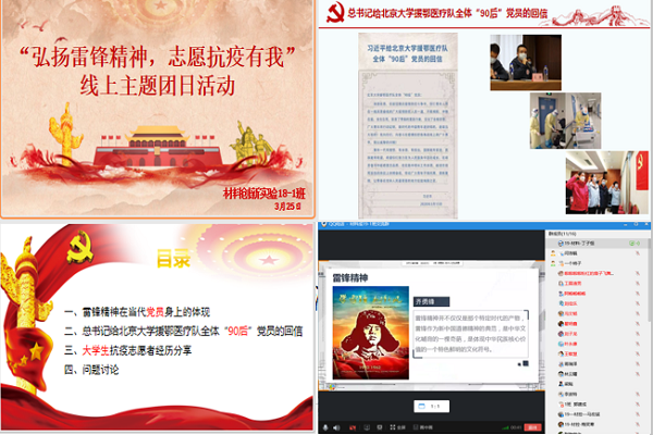 重温雷锋事迹,深化时代雷锋精神内涵——积极组织开展线上主题团日活动。材料学院53个团支部依托QQ群、腾讯会议等线上方式,开展了“弘扬雷锋精神,志愿抗疫有我”“学习雷锋精神,致敬抗疫者”“弘扬雷锋精神,时代楷模在我身边”等主题团日活动。通过重温雷锋故事,重读《雷锋日记》,重看《雷锋》电影,重唱《学习雷锋好榜样》,线上参观“雷锋纪念馆”等环节,学习永恒的雷锋精神。通过分享“武汉,我的战役日记”“致敬逆行者”,触摸“抗疫群英谱”,感悟疫情时期的雷锋精神。通过再读总书记给北京大学援鄂医疗队全体“90后”党员的回信,传承新青年的时代雷锋精神。线上主题团日活动开展过程中,各团支部青年学生积极分享自己眼中的“活雷锋”,纷纷表示要从我做起,尤其是在疫情防控时期,用实际行动向雷锋同志致敬,争做新时代雷锋精神的传承者与践行者。