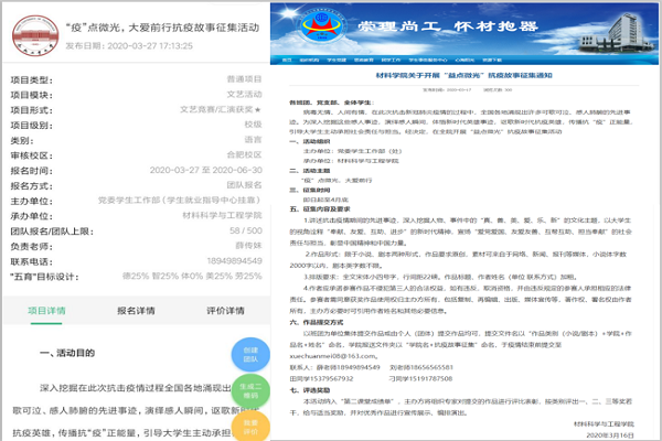 传承雷锋精神,讲述新时代雷锋故事——积极开展抗疫微故事征集活动。材料学院依托第二课堂平台,在全院学生中深入开展“益点微光,大爱前行”抗疫微故事征集活动,鼓励学生在疫情期间讲述抗击疫情的先进事迹,深入挖掘人物、事件中的“真、善、美、爱、乐、新”的文化主题,以大学生的视角诠释“奉献、友爱、互助、进步”的新时代精神,宣扬“爱党爱国、友爱友善、互帮互助、担当奉献”的社会责任与担当,讲述新时代雷锋故事,体悟新时代英雄事迹,讴歌新时代抗疫英雄,传播抗“疫”正能量,活动开展过程中已有近200名同学报名参加。