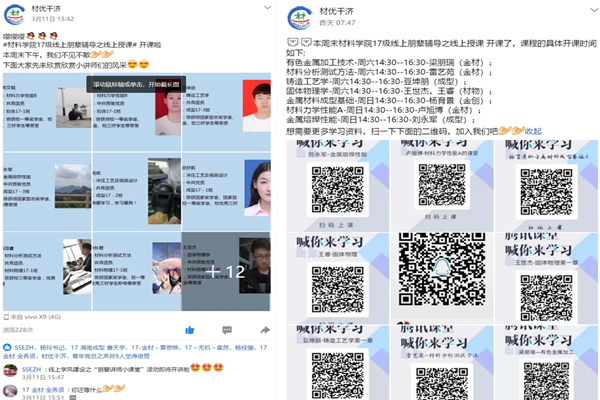 为贯彻落实学校对新冠肺炎疫情防控工作部署,积极响应学校“学雷锋”志愿服务月活动要求,做好疫情期间线上教学服务,结合实际开展朋辈帮扶,自新学期线上授课伊始,材料学院依托各类网络平台持续开展“材优干济”系列学风建设活动。营造良好的线上学习氛围,引导学生端正学习态度、及时互助答疑解惑、提升自主学习能力,助力良好学风形成。