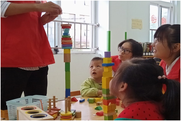 到达康复中心后,为了确保各项爱心志愿活动的顺利进行,康复中心的老师对志愿者们进行了简短的培训。随后,在康复中心工作人员的引导下孩子们纷纷坐到了自己的座位上,志愿者们为孩子们准备了不同种类的课程教学和小游戏。在图形拼接、数字运算游戏中志愿者们耐心的引导着每一个孩子。课余时间,志愿者们以聊天、搞笑表演的方式为孩子们带去了欢乐,看到孩子们咯咯地笑,志愿者们内心也无比的快乐。