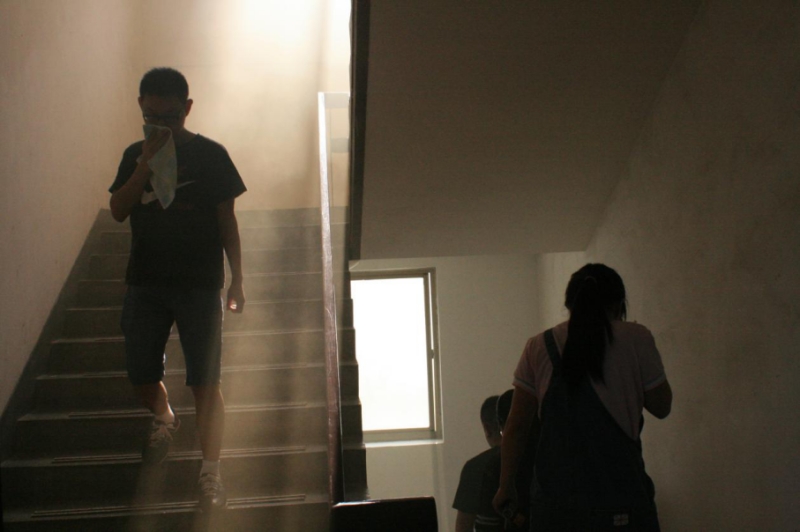 在认真听讲及观摩后,负责疏散的同学分别站到每层楼的关键位置,引导同学在模拟的烟雾场景中有序疏散。演习开始后,老师和同学们面对熊熊的烟雾,表现十分镇定,从容有序地疏散至楼底的安全位置。演习中,消防官兵分模拟了在某屋内有被困人员,以及某楼层有大火的情景;并且使用消防担架营救被困人员、使用高压水枪扑灭明火。在演习后,每位同学都亲自体验了如何正确使用灭火器,以及发生火灾时如何采取应急措施,每位同学都应该具备基本的消防知识,并熟练掌握灭火器的使用方法。