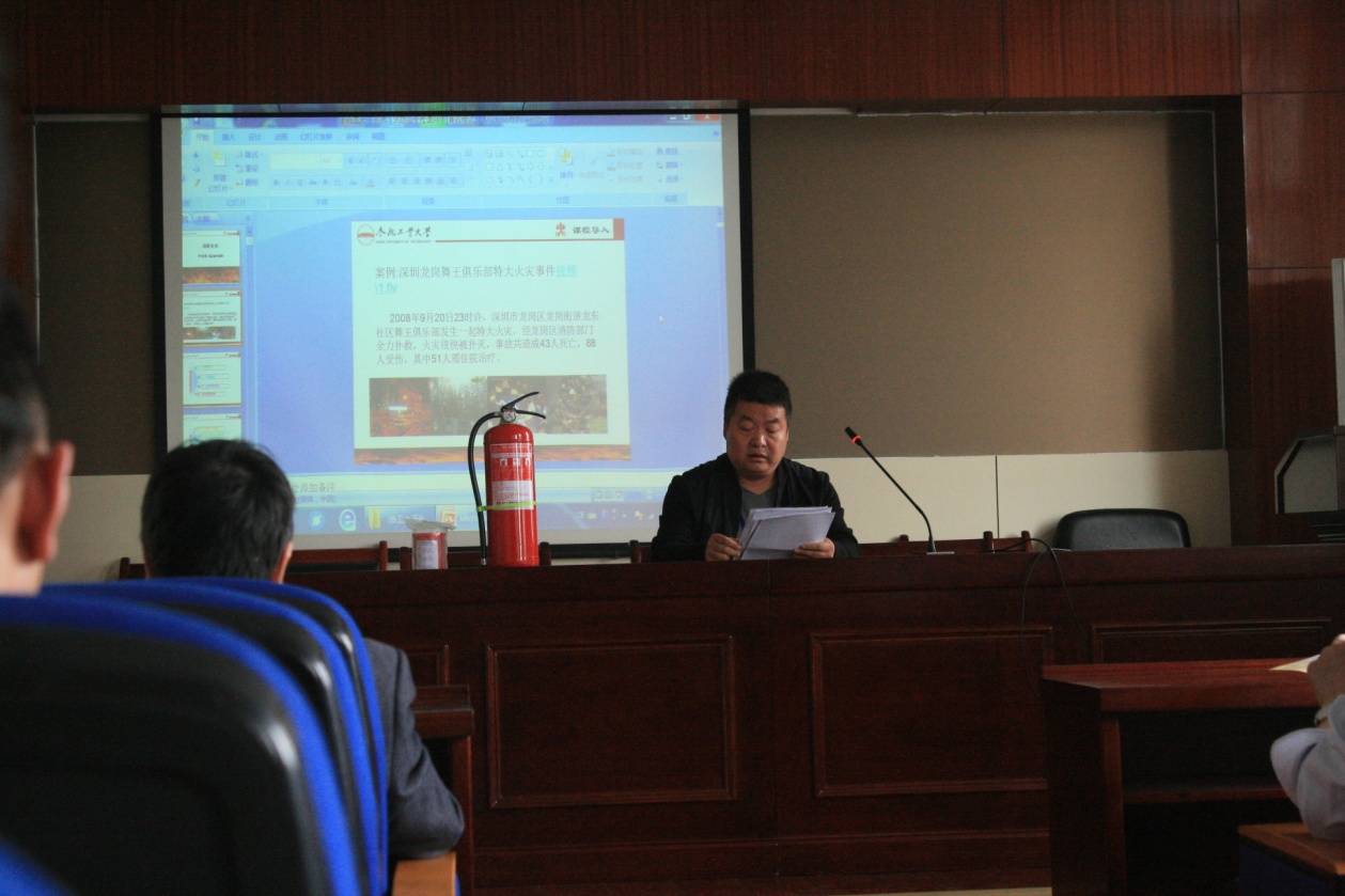 主持人首先介绍了举办这次讲座的主要目的和内容,在热烈的掌声中,校保卫办的焦峰老师上台为参加学习的研究生作了有关消防的知识普及。焦峰老师为大家讲解了基本消防安全制度,并简要介绍了相关法律法规,旨在使大家形成基本消防观念。焦峰老师结合实际案例,并配合一幅幅触目惊心的图片,一段段发人深省的视频,生动地讲解了消防安全知识,使在场同学都颇受震动;此外,焦峰老师还介绍了火灾应对措施,介绍了常规消防设施的使用方法。根据校保卫办的工作安排,材料学院后续还将举行模拟火灾现场应对方法真人演习,进一步增强同学们在遭遇到火灾时的自救能力。