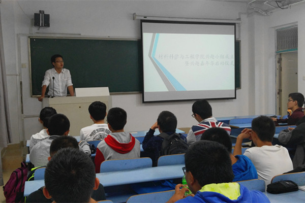 仪式上,主持人就材料学院兴趣小组建设的过程、现状进行了说明,详细介绍了学院第一批成立的9个兴趣小组的具体情况,宣读了兴趣小组管理制度。学习小组负责同学作为兴趣小组代表发言,就兴趣小组的后续建设和活动组织进行了展望。随后,学院团总支书记何昊昱同学介绍了本次兴趣嘉年华活动的具体内容,公布了活动的实施方案。兴趣小组指导老师周矗对各小组的成立表示祝贺,并介绍了学院积极推动兴趣小组建设的目的及后期工作规划,对兴趣小组的组织者和参与者提出了明确的要求。
