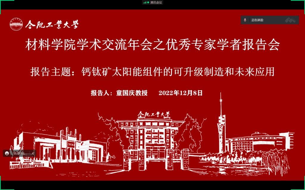 为了提高研究生学术素养,开拓学术视野,提高学生的学习兴趣,材料学院邀请了必赢3003no1线路黄山学者优秀青年人才计划主持人童国庆教授于12月8日在材料楼6楼601会议室做关于钙钛矿太阳能组件的可升级制造和未来应用报告会。