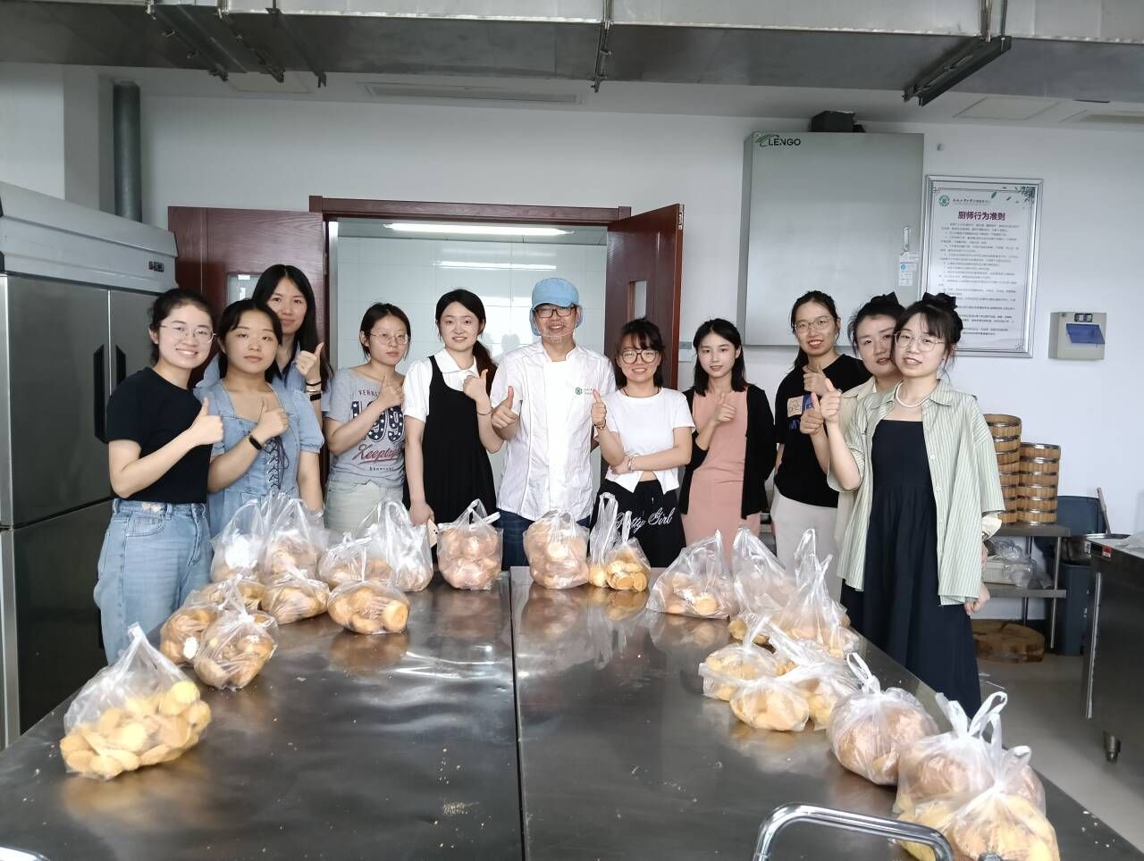 随后,在陈师傅的指导下,同学们展开实践,揉制泡芙面糊、挤胚、制作酥皮;搅拌曲奇面团、尝试裱花……操作过程虽充满挑战,但在陈师傅的耐心指导和同学们的互相帮助下,大家渐入佳境。当由个人亲手制作的金黄酥脆的泡芙和香气扑鼻的曲奇新鲜出炉时,喜悦与成就感洋溢在每位同学脸上。
